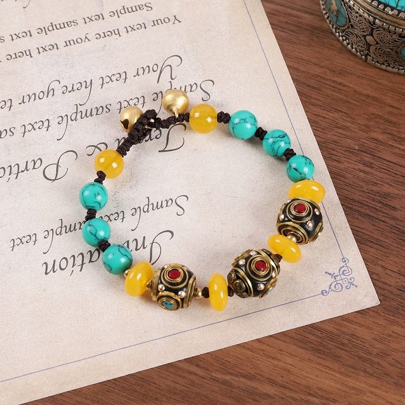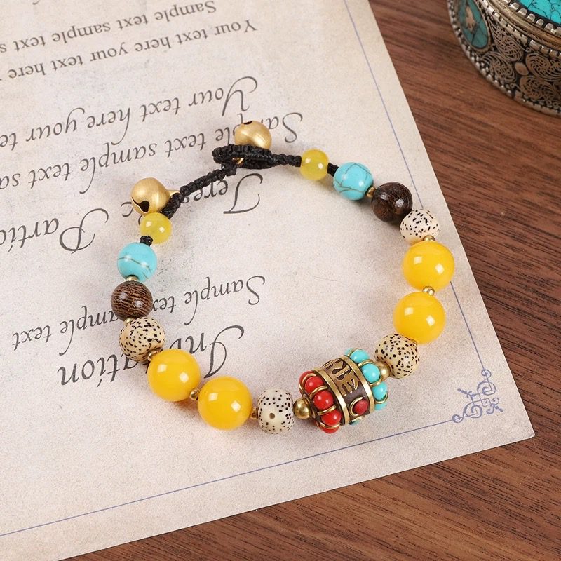 Material Yellow resin beads, bodhi seed beads, turquoise-style beads, wood grain beads, vintage brass prayer wheel, durable waxed cord