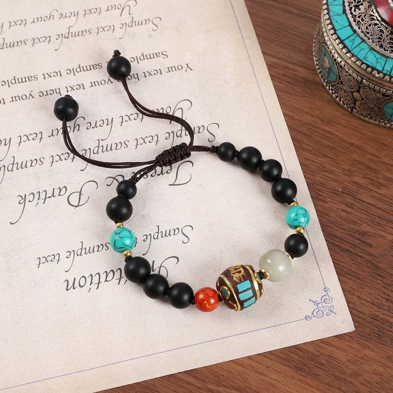 • Sacred Tibetan Prayer Wheel Charm: The centerpiece is an intricately carved vintage brass prayer wheel, inlaid with vibrant red and turquoise accents and engraved with traditional Tibetan mantras. In Buddhist culture, the prayer wheel represents the spread of positive energy, protection, and spiritual blessings to the wearer.